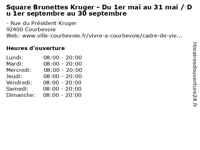 1 Square Brunettes Kruger - Du 1er avril au 30 avril (Distance: 0,00 km) - Rue du Président Kruger, 92400 Courbevoie 1er, 30, arbre, au, avril, brunettes, du, espace vert, forêt, jardin, kruger, loisirs, nature, parc, prairie, square 2 Square Brunettes Kruger - Du 1er octobre au 31 mars (Distance: 0,00 km) - Rue du Président Kruger, 92400 Courbevoie 1er, 31, arbre, au, brunettes, du, espace vert, forêt, jardin, kruger, loisirs, mars, nature, octobre, parc, prairie, square 3 Jardin des Tournelles - Du 1er avril au 30 avril (Distance: 0,18 km) - Rue Jean-Pierre Timbaud, 92400 Courbevoie 1er, 30, arbre, au, avril, des, du, espace vert, forêt, jardin, loisirs, nature, parc, prairie, square, tournelles 4 Jardin des Tournelles - Du 1er mai au 31 mai / Du 1er septembre au 30 septembre (Distance: 0,18 km) - Rue Jean-Pierre Timbaud, 92400 Courbevoie 1er, 30, 31, arbre, au, des, du, espace vert, forêt, jardin, loisirs, mai, nature, parc, prairie, septembre, square, tournelles 5 Angle Simonin et Hôtel de Ville - Du 1er avril au 30 avril (Distance: 0,18 km) - Place Hérold, 92400 Courbevoie 1er, 30, angle, arbre, au, avril, de, du, espace vert, et, forêt, hôtel, jardin, loisirs, nature, parc, prairie, simonin, square, ville 6 Promenade Saint Nicolas - Du 1er mai au 31 mai / Du 1er septembre au 30 septembre (Distance: 0,44 km) - Promenade Saint Nicolas, 92400 Courbevoie 1er, 30, 31, arbre, au, du, espace vert, forêt, jardin, loisirs, mai, nature, nicolas, parc, prairie, promenade, saint, septembre, square |