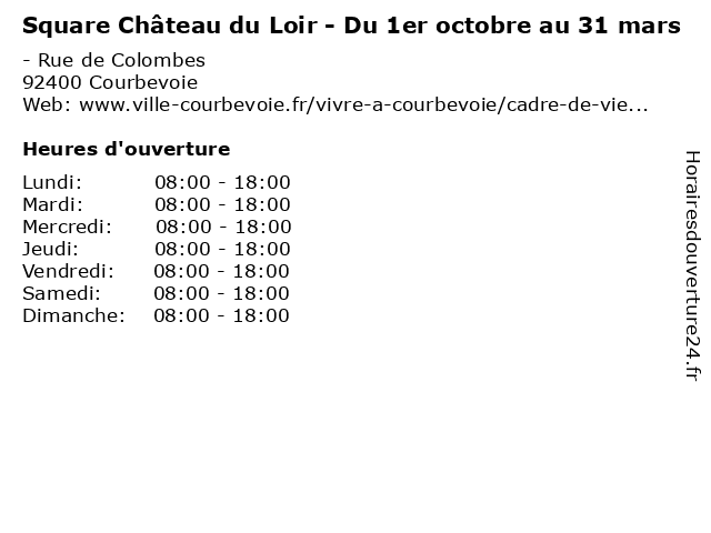 1 Square Château du Loir - Du 1er mai au 31 mai / Du 1er septembre au 30 septembre (Distance: 0,00 km) - Rue de Colombes, 92400 Courbevoie 1er, 30, 31, arbre, au, château, du, espace vert, forêt, jardin, loir, loisirs, mai, nature, parc, prairie, septembre, square 2 Square Château du Loir - Du 1er juin au 31 août (Distance: 0,00 km) - Rue de Colombes, 92400 Courbevoie 1er, 31, août, arbre, au, château, du, espace vert, forêt, jardin, juin, loir, loisirs, nature, parc, prairie, square 3 Square des Boudoux - Du 1er octobre au 31 mars (Distance: 0,24 km) - Rue des Boudoux, 92400 Courbevoie 1er, 31, arbre, au, boudoux, des, du, espace vert, forêt, jardin, loisirs, mars, nature, octobre, parc, prairie, square 4 Square des Boudoux - Du 1er mai au 31 mai / Du 1er septembre au 30 septembre (Distance: 0,24 km) - Rue des Boudoux, 92400 Courbevoie 1er, 30, 31, arbre, au, boudoux, des, du, espace vert, forêt, jardin, loisirs, mai, nature, parc, prairie, septembre, square 5 Square des Boudoux - Du 1er juin au 31 août (Distance: 0,24 km) - Rue des Boudoux, 92400 Courbevoie 1er, 31, août, arbre, au, boudoux, des, du, espace vert, forêt, jardin, juin, loisirs, nature, parc, prairie, square 6 Square Brunettes Kruger - Du 1er octobre au 31 mars (Distance: 0,25 km) - Rue du Président Kruger, 92400 Courbevoie 1er, 31, arbre, au, brunettes, du, espace vert, forêt, jardin, kruger, loisirs, mars, nature, octobre, parc, prairie, square |
