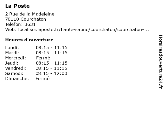 1 La Poste (Distance: 3,84 km) 2 Rue de l'église, 70110 Athesans etroitefontaine athesans etroitefontaine, la, la poste, poste 2 La Poste (Distance: 7,15 km) - Rue Vacheresse, 70200 Moffans-et-Vacheresse express chronopost, la, poste, réexpédition internationale 3 La Poste (Distance: 8,86 km) 29 Rue de la 5ème Division Blindée, 25750 Arcey express chronopost, la, poste, réexpédition internationale 4 La Poste (Distance: 11,41 km) 15 Grande Rue, 25340 Gondenans-Montby agence postale, courrier postal, expédition internationale, la, poste 5 La Poste (Distance: 11,43 km) 16 Grande Rue, 25113 Sainte-Marie express chronopost, la, poste, réexpédition internationale 6 La Poste (Distance: 11,47 km) 10 Grande Rue, 25340 Uzelle express chronopost, la, poste, réexpédition internationale |