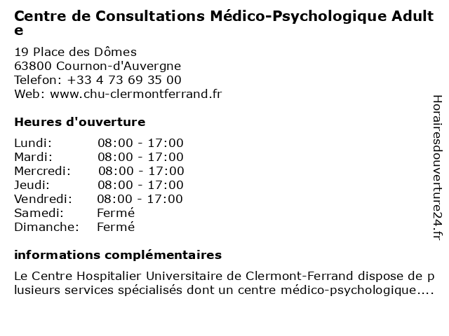 Termes de recherche pour Centre de Consultations Médico-Psychologique Adulte:de, centre, adulte, médico, consultations, psychologique |