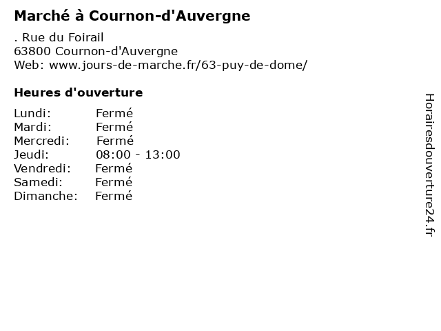 1 Marché à Cournon-d'Auvergne (Distance: 0,20 km) . Place Joseph Gardet, 63800 Cournon cournon, d'auvergne, frutas, hortalizas, marché, mercado, verduras 2 Marché aux Fleurs (Distance: 2,27 km) 42 Avenue d'Aubière, 63800 Cournon-d'Auvergne aux, fleurs, marché 3 Marché à Lempdes (Distance: 3,38 km) . Place du Poids de ville, 63370 Lempdes frutas, hortalizas, lempdes, marché, mercado, verduras 5 Marché à Clermont-Ferrand (Distance: 8,38 km) . Rues Chevreul, 63000 Clermont Ferrand clermont, ferrand, frutas, hortalizas, marché, mercado, verduras 6 Marché à Clermont-Ferrand (Distance: 8,59 km) . Rue des Chambrettes, 63000 Clermont Ferrand clermont, ferrand, frutas, hortalizas, marché, mercado, verduras |