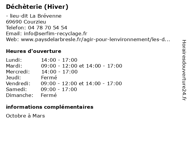 1 Déchèterie (Hiver) (Distance: 9,78 km) - lieu-dit les Auberges, 69770 Montrottier bennes, déchets, déchèterie, détritus, gravats, hiver 2 Déchèterie (Hiver) (Distance: 9,79 km) - lieu-dit Sous La Roche, 69210 Fleurieux-sur-l'Arbresle bennes, déchets, déchèterie, détritus, gravats, hiver 3 Déchèterie (Hiver) (Distance: 12,73 km) - lieu-dit Les Laÿs, 69850 Saint-Martin-en-Haut bennes, déchets, déchèterie, détritus, gravats, hiver 4 Déchèterie (Hiver) (Distance: 13,63 km) 2 avenue Louis Pradel, 69290 Saint-Genis-les-Ollières bennes, débarras, déchèterie, détritus, hiver, mars, novembre, ordures, poubelles 5 Déchèterie (Hiver) (Distance: 15,99 km) - Route de Saint Antoine, 69380 Chazay-d'Azergues bennes, déchets, déchèterie, détritus, gravats, hiver 6 Déchèterie (Hiver) (Distance: 16,33 km) - impasse des Anciennes Vignes, 69410 Champagne-au-Mont-d'Or bennes, débarras, déchèterie, détritus, hiver, mars, novembre, ordures, poubelles |