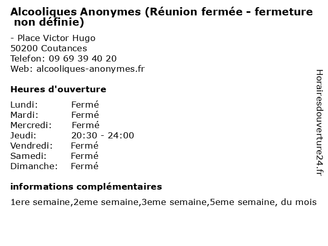 Termes de recherche pour Alcooliques Anonymes (Réunion fermée - fermeture non définie):reunion, non, fermeture, alcooliques, anonymes, définie, fermée |