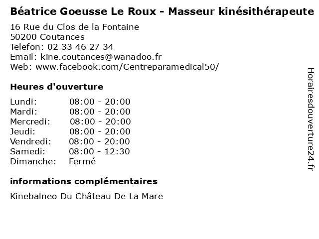Termes de recherche pour Béatrice Goeusse Le Roux - Masseur kinésithérapeute:le, med, roux, traitement, docteur, médecin, masseur, consultation, beatrice, kinésithérapeute, goeusse |