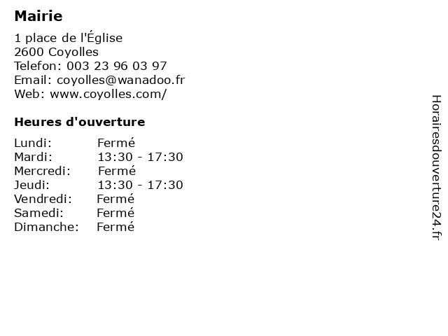 2 Mairie (Distance: 8,57 km) 4 rue de l'Escadron-de-Gironde, 02600 Vivières administration, mairie, public, service 3 Mairie (Distance: 8,72 km) 29 rue de la Chaussée, 02460 La Ferte Milon administration, mairie, public, service 4 Mairie (Distance: 9,76 km) 10 Rue Saint-Antoine, 02600 Faverolles administration, mairie, public, service 6 Mairie (Distance: 10,80 km) 7 rue des Templiers, 02600 Mortefontaine administration, mairie, public, service |