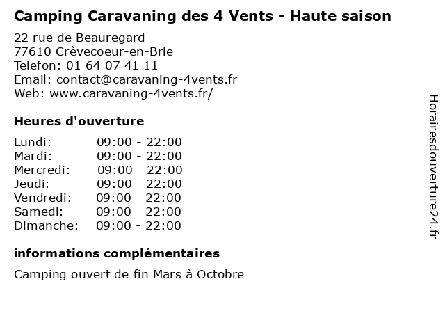 1 Camping Caravaning des 4 Vents - Réception Basse Saison (Distance: 0,00 km) 22 rue de Beauregard, 77610 Crèvecoeur-en-Brie basse, camping, caravaning, des, mobil home, réception, saison, tourisme, vents 2 Camping Iris Parc Le Chêne Gris (Distance: 9,47 km) 24 place de la Gare de Faremoutiers, 77515 Pommeuse camping, chêne, gris, iris, le, parc, tourisme, vacances 3 Camping Fredland (Distance: 10,67 km) - Route de Liverdy, 77220 Tournan en Brie camping, fredland, hébergement, tourisme 4 Camping Fredland - Restaurant/snack (avril à septembre) (Distance: 10,67 km) - Route de Liverdy, 77220 Tournan en Brie avril, camping, fredland, hébergement, restaurant/snack, septembre, tourisme 5 Camping Country Park - Crécy la Chapelle (Distance: 10,91 km) - route de Serbonne, 77580 Crécy-la-Chapelle camping, chapelle, country, crécy, de, la, le, park, soleil, tourisme, vacances 6 Camping Etangs Fleuris (Restauration à emporter, juillet et août) (Distance: 11,41 km) - Route de la couture, 77131 Touquin août, camping, emporter, et, etangs, fleuris, hebergement, juillet, restauration, tohapi, tourisme |