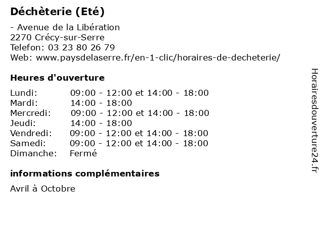 1 Déchèterie (Eté) (Distance: 19,71 km) n/c Route de Colonfay, 02120 Sains-Richaumont avril, débarras, déchets, déchèterie, eté, octobre, poubelles 2 Déchèterie (Hiver) (Distance: 0,00 km) - avenue de la Libération, 02270 Crécy-sur-Serre débarras, déchets, déchèterie, hiver, mars, novembre, poubelles 3 Déchèterie (Distance: 8,94 km) 60 Rue Chambry, 02000 Aulnois-sous-Laon déchèterie, gravats, huiles usées, la réception des déchets et écocentres, les appareils électroménagers, les déchets verts, papier et carton en quantité 5 Déchèterie (Distance: 13,32 km) - Rue de Verdun, 02250 Marle déchèterie, gravats, huiles usées, la réception des déchets et écocentres, les appareils électroménagers, les déchets verts, papier et carton en quantité 6 Déchèterie (Distance: 16,88 km) - Route de Villers le Sec, 02240 Ribemont déchèterie, gravats, huiles usées, la réception des déchets et écocentres, les appareils électroménagers, les déchets verts, papier et carton en quantité |