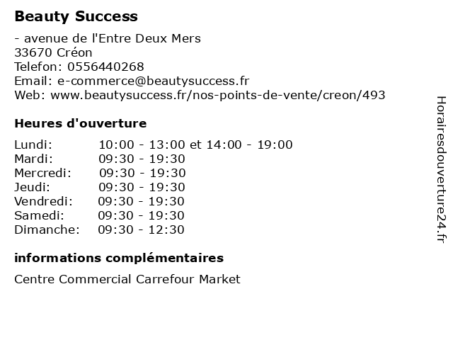 1 Beauty Success (Distance: 6,92 km) - route de Sauveterre, 33670 Créon bains, beauty, corps, maquillage, parfums, soins visage, success 2 Beauty Success (Distance: 15,58 km) 12 Condorcet, 40008 Cenon accessoires, beauty, des parfums, le beauté, le maquillage, success 3 Beauty Success (Distance: 17,51 km) - Avenue du Général De Gaulle, 33500 Libourne beauty, beauté, cosmétique, maquillage, parfum, success 4 Beauty Success (Distance: 17,54 km) . Route de Toulouse, 33140 Villenave d Ornon beauty, beauté, cosmétique, maquillage, parfum, succes, success 5 Beauty Success (Distance: 17,57 km) - Centre Commercial Leclerc, 33500 Libourne accessoires, beauty, corps&bain, homme, parfum, parfumeries, success 6 Beauty Success (Distance: 17,68 km) - Route de Toulouse, 47240 Castelculier beauty, beauté, parfumeries, santé, sport, success |