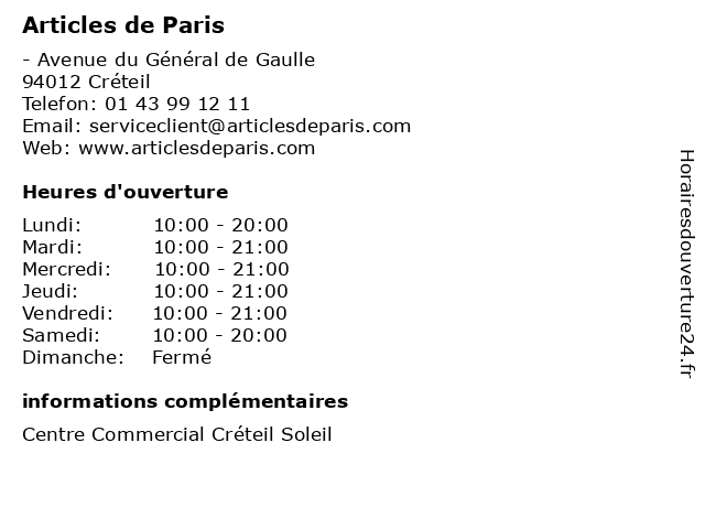 1 Articles de Paris (Distance: 17,17 km) 4 Boulevard Gallieni, 92390 Villeneuve-la-Garenne accessoires, articles, bijoux, de, fantaisie, maroquinerie, mode, montres, paris, sacs 2 Draeger Paris (Distance: 0,00 km) - Avenue du Général de Gaulle, 94012 Créteil accessoires, draeger, magasin, paris, prêt à porter, vêtements 3 Laboratoire Créteil Palais - BIOGROUP PARIS OUEST (Distance: 0,57 km) 16 Allée Parmentier Centre Commercial Du Palais, 94000 Créteil biogroup, créteil, dépistages, laboratoire, laboratoire de diagnostic, ouest, palais, paris 4 Relay - Hôpitaux de Paris (Distance: 0,77 km) 51 Avenue de Lattre Tassigny, 94000 Creteil beverages, de, food, gifts, hôpitaux, paper, paris, printing, relay, service products, telephone 5 Novotel Paris Créteil Le Lac (Distance: 1,25 km) Rue Jean Gabin, 94000 Creteil créteil, lac, le, novotel, paris 6 Agence d'Intérim Manpower Grand Paris Environnement (Distance: 1,28 km) 53 Avenue Pierre Brossolette, 94000 Créteil agence, agence de recrutement, agence intérim, agence pour l'emploi, cabinet de recrutement, cdi, d'intérim, environnement, grand, intérim, manpower, paris, recrutement |