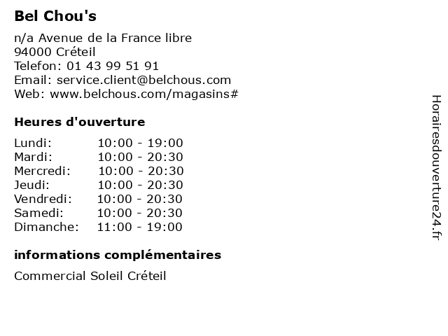 1 Bel Chou's (Distance: 7,55 km) 247 Avenue Daumesnil, 75012 Paris bel, boutiques, chaussures, chou's, magasins, vente 2 Bel Chou's (Distance: 7,56 km) 85 Route de Provins, 94430 Chennevières-sur-Marne bel, boutiques, chaussures, chou's, magasins, vente 3 Bel Chou's (Distance: 7,70 km) 63 avenue de Fontainebleau, 94270 Le Kremlin-Bicêtre bel, boutiques, chaussures, chou's, magasins, vente 4 Bel Chou's (Distance: 8,34 km) - avenue du Maréchal Joffre, 94120 Fontenay-sous-Bois bel, belchou's, boutique, chou's, cuir, femmes, hommes, magasin, vêtements 5 Bel Chou's (Distance: 9,42 km) 41 Avenue Auguste Blanqui, 75013 Paris bel, boutiques, chaussures, chou's, magasins, vente 6 Bel Chou's (Distance: 9,97 km) 28 Avenue du Général de Gaulle, 93170 Bagnolet bel, boutiques, chaussures, chou's, magasins, vente  |