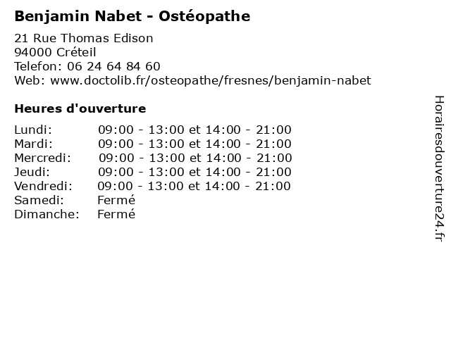 1 Benjamin Nabet - Ostéopathe (Distance: 10,55 km) 5 Rue Jules Guesde, 94260 Fresnes benjamin, domicile, dos, douleur, lumbago, mal, nabet, ostéopathe, torticolis 2 Sophie Nabet - Orthoptiste (Distance: 0,85 km) 35 Rue de Paris, 94000 Créteil medical, nabet, orthoptique, orthoptiste, sophie, strabologie 3 Benjamin Dulck - Pédicure-podologue (Distance: 1,52 km) 74ter Rue du Général Leclerc, 94000 Créteil benjamin, cheville, dulck, orteil, pied, podologue, pédicure 4 Dr Aurélia Nabet - Chirurgien-dentiste - secrétariat (Distance: 1,66 km) 41 Rue Émile Zola, 94140 Alfortville aurélia, chirurgien, consultation, dentiste, docteur, dr, med, médecin, médecine, nabet, secrétariat, traitement 5 Benjamin Laloum - Masseur-kinésithérapeute (Distance: 2,30 km) 4 Rue Bourdignon, 94100 Saint-Maur-des-Fossés benjamin, docteur, kine, kinesitherapeute, kinésithérapeute, laloum, masseur 6 Jiraud Benjamin Suilin (Distance: 3,57 km) 1 Rue Gabrielle, 94220 Charenton Le Pont benjamin, jiraud, restaurants, suilin |