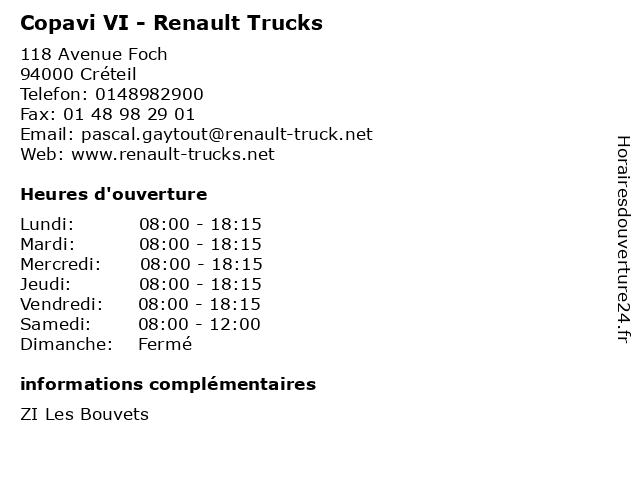 2 Renault - Borne de Recharge Electrique (Distance: 1,05 km) - Rue de Valenton, 94000 Créteil borne, de, electrique, recharge, renault, électrique 3 Garage des Ardoines - Renault (Distance: 2,31 km) 7 rue des Ardoines, 94400 Vitry-sur-Seine ardoines, atelier, automobile, concessionnaire, des, entretien, garage, renault, réparation, vente 4 Créteil Autos - Renault (Distance: 2,44 km) 185 Rue du Général Leclerc, 94000 Créteil atelier, automobile, autos, concessoinnaire, créteil, entretien, garage, renault, réparation 5 Renault - Borne de Recharge Electrique (Distance: 2,50 km) 8 Avenue du Professeur Cadiot, 94700 Maisons-Alfort borne, de, electrique, recharge, renault, électrique 6 Renault SN - DJP (Distance: 2,67 km) 58 Rue de Choisy, 94400 Vitry-sur-Seine atelier, automobile, concessionnaire, djp, entretien, garage, renault, réparation, sn, vente |