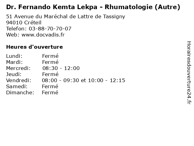 1 Dr. Fernando Kemta Lekpa - Rhumatologie (Consultation sur rendez-vous) (Distance: 0,00 km) 51 Avenue du Maréchal de Lattre de Tassigny, 94010 Créteil consultation, docteur, dr., fernando, kemta, lekpa, rendez, rhumatologie, santé, sur, vous 2 Dr. Fernando Kemta Lekpa - Rhumatologie (Consultation libre) (Distance: 0,00 km) 51 Avenue du Maréchal de Lattre de Tassigny, 94010 Créteil consultation, docteur, dr., fernando, kemta, lekpa, libre, rhumatologie, santé 3 Dr Fernando Neves - Radiologue (Distance: 6,87 km) 10 Rue de l'Orangerie, 94170 Le Perreux-sur-Marne centre, d'imagerie, de, diagnostique, dr, fernando, imagerie, imef, l'orangerie, médicale, neves, radiologie, radiologue, thérapeutique 4 Dos Santos Brito Antonio Fernando (Distance: 11,35 km) 75 Rue Pierre, 91230 Montgeron antonio, boucheries, brito, dos, fernando, poissonneries, santos 5 Rosso Camacho Rosso Fernando (Distance: 11,37 km) 179 Avenue De Paris, 92320 Chatillon camacho, fernando, restaurants, rosso 6 Borges Nascimento Fernando (Distance: 12,29 km) 56 Boulevard De Vanves, 92320 Chatillon borges, fernando, nascimento, restaurants |