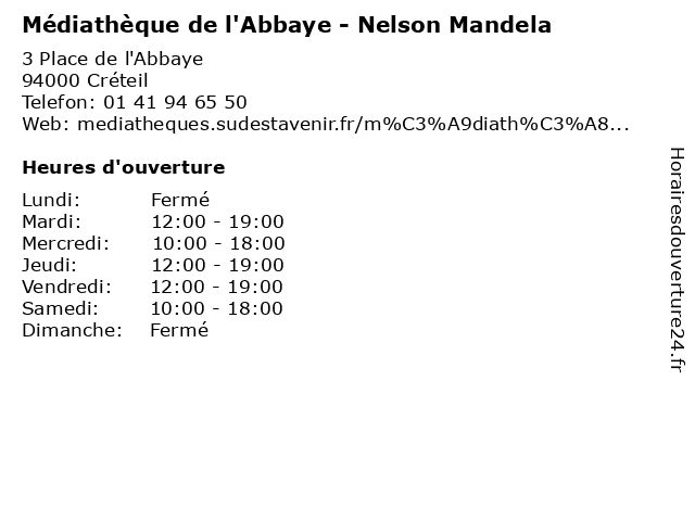 1 Pharmacie de l'Abbaye (Distance: 0,00 km) 1 place de l'Abbaye, 94000 Créteil 'abbaye, de, homéopathie, l'abbaye, médicaments, orthopédie, parapharmacie, pharmacie 2 Médiathèque (Distance: 1,07 km) 1 rue de la commune, 94381 Bonneuil-sur-Marne cd audio, cd.rom, livres, médiathèque, revues 3 Médiathèque - vacances estivales (Distance: 1,40 km) 1 rue de la commune, 94381 Bonneuil-sur-Marne cd audio, cd.rom, estivales, horaires, livres, médiathèque, revues, vacances 4 Médiathèque de la Croix des Mèches (Distance: 1,62 km) . Rue Charpy, 94000 Créteil cd audio, cd.rom, croix, de, des, la, livres, mèches, médiathèque, revues 5 Yespark, location de parking au mois - Médiathèque Île Saint-Pierre - 13 rue Nelson Mandela - Alfortville (Distance: 3,34 km) 13 Rue Nelson Mandela, 94140 Alfortville 13, alfortville, au, de, location, mandela, mois, médiathèque, nelson, parking, pierre, rue, saint, yespark, île 6 Yespark, location de parking au mois - Lycée Maximilien Perret - rue Nelson Mandela - Alfortville (Distance: 3,54 km) 6 Rue Nelson Mandela, 94140 Alfortville alfortville, au, de, location, lycée, mandela, maximilien, mois, nelson, parking, perret, rue, yespark |