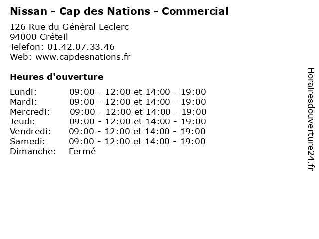 1 Nissan - Cap des Nations - Commercial (Distance: 3,95 km) 7 Avenue Général de Gaulle, 94500 Champigny-sur-Marne cap, commercial, concession, des, entretien, nations, neuves, nissan, occasion, réparation, vente, voitures 2 Nissan - Cap des Nations - Atelier et magasin (Distance: 0,00 km) 126 Rue du Général Leclerc, 94000 Créteil atelier, automobile, cap, concessionnaire, des, et, garage, magasin, nations, neuve, nissan, occasion, réparation, vente 3 Crédit Industriel et Commercial (CIC) (Distance: 0,64 km) 54 Rue Du General Leclerc, 94000 Creteil agence, assurance, banque, cic, commercial, credit industriel et commercial, crédit, et, industriel 4 Pharmacie de Créteil Soleil (Cap santé 2) (Distance: 1,17 km) - Avenue de la France Libre, 94000 Créteil affaires, cap, créteil, de, médecine, pharmacie, produit, santé, service, soleil 5 Centre Commercial Créteil Soleil (Distance: 1,19 km) 101 Avenue du Général de Gaulle, 94000 Créteil centre, commercial, créteil, soleil 6 Pharmacie Soumet Cap Santé (Distance: 1,19 km) 101 Avenue du Général de Gaulle, 94012 Creteil alimentation, beauté & santé, cap, culture & loisirs, enfants, high-tech, maison & déco, mode, pharmacie, restaurants, santé, soumet  |