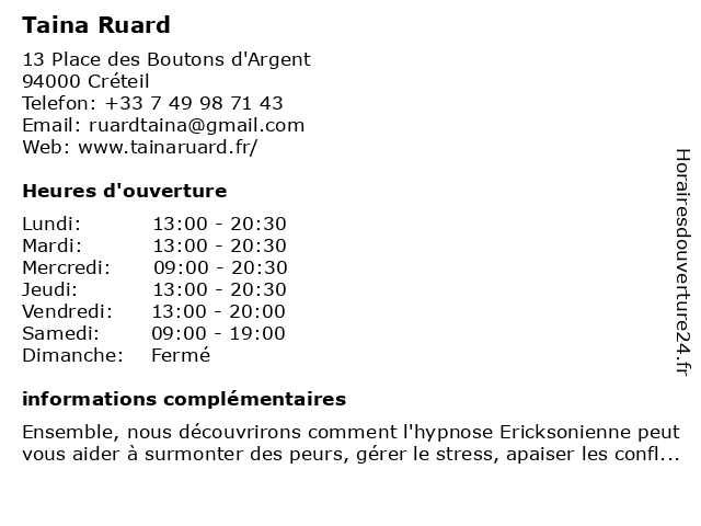 1 Dr Taina Louissaint - Endocrinologue (Distance: 0,45 km) 51 Avenue du Maréchal de Lattre de Tassigny, 94000 Créteil consultation, docteur, dr, endocrinologue, louissaint, med, medecine, medical, médecin, taina, traitement 2 Taina Victor - Psychologue (Distance: 11,81 km) 23 Rue d'Alleray, 75015 Paris psy, psychiatre, psychologue, sante, soins, taina, victor 3 Taina Victor - Psychologue (Distance: 14,15 km) 15 Avenue de France, 91300 Massy folie, psychiatre, psychiatrie, psychiatrique, psychologue, taina, victor |