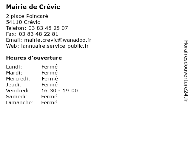 | Lundi | Fermé |