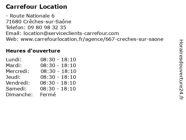 1 Carrefour Location (Distance: 16,51 km) - Avenue de Verdun, 69220 Belleville agence, carrefour, location, utilitaires, véhicules 2 Carrefour (Distance: 0,00 km) . Route Nationale 6, 71680 Crêches-sur-Saône carrefour, hypermarche, marche, market 3 Carrefour Banque (Distance: 0,00 km) - Route Nationale 6, 71680 Crêches-sur-Saône assurances, banque, carrefour, services 4 Carrefour Station Service (Distance: 0,80 km) . Route Nationale 6, 71680 Creches Sur Saone automobiles, carrefour, oil, service, services, station, stations essences 5 Carrefour Station Service (Distance: 16,25 km) . Route De Neuville Les Dames, 01540 Vonnas automobiles, carrefour, oil, service, services, station, stations essences 6 Carrefour Station Service (Distance: 16,50 km) . Avenue De Verdun, 69220 Belleville automobiles, carrefour, oil, service, services, station, stations essences |