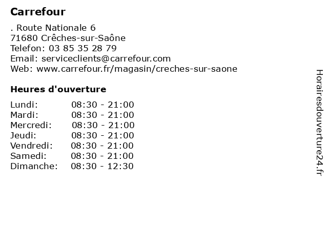 | 1 Carrefour (Distance: 16,50 km) . Avenue De Verdun, 69220 Belleville carrefour, hypermarche, marche, market 2 Carrefour Banque (Distance: 0,00 km) - Route Nationale 6, 71680 Crêches-sur-Saône assurances, banque, carrefour, services 3 Carrefour Location (Distance: 0,00 km) - Route Nationale 6, 71680 Crêches-sur-Saône agence, carrefour, location, utilitaires, véhicules 4 Carrefour Station Service (Distance: 0,80 km) . Route Nationale 6, 71680 Creches Sur Saone automobiles, carrefour, oil, service, services, station, stations essences 5 Carrefour Station Service (Distance: 16,25 km) . Route De Neuville Les Dames, 01540 Vonnas automobiles, carrefour, oil, service, services, station, stations essences 6 Carrefour Station Service (Distance: 16,50 km) . Avenue De Verdun, 69220 Belleville automobiles, carrefour, oil, service, services, station, stations essences |
