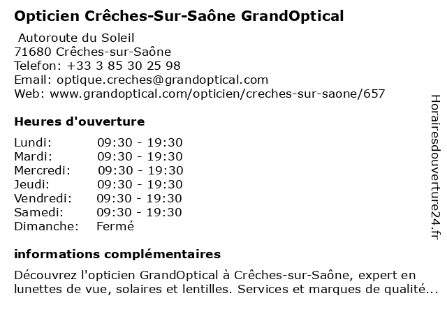 1 Opticien Crêches-Sur-Saône | Alain Afflelou (Distance: 0,00 km) Centre Commercial Carrefour Les Bouchardes, 71680 Crêches-Sur-Saône afflelou, alain, cabinet d'ophtalmologie, crêches, magasin de lunettes de soleil, ophtalmologie, opticien, optométrie, saône, sur 2 Opticien Générale d'Optique CRECHES MACON (Distance: 0,03 km) Rue du Mâconnais, 71680 Crêches-sur-Saône creches, d'optique, générale, macon, opticien 3 Opticien MÂCON Optical Center (Distance: 3,54 km) 117 Route de Lyon, 71000 Mâcon center, mâcon, optical, opticien 4 Atol Mon Opticien Mâcon Ville (Distance: 6,57 km) 26 Rue de la Barre, 71000 Mâcon atol, atol les opticiens, atol mon opticien, lentilles, lunettes de soleil, lunettes de vue, mon, mâcon, opticien, opticien mâcon, ville 5 Opticien Mâcon - Optic 2000 (Distance: 6,65 km) 13 Rue de l'Héritan, 71000 Mâcon 2000, lentilles de contact, lunettes de soleil, lunettes de vue, mâcon, optic, optic2000, opticien, opticien optic2000, ray-ban, rayban 6 Opticien MACON Générale d'Optique (Distance: 8,87 km) 224 Avenue Charles de Gaulle, 71000 Mâcon d'optique, examen de la vue, générale, lentilles de contact, lentilles progressives, lunette ray ban, lunettes, lunettes anti-lumière bleue, lunettes de conduite de nuit, lunettes de conduites de nuit, lunettes de soleil, lunettes de soleil pour enfant, lunettes de soleil pour femme, lunettes de soleil pour homme, lunettes de vue, lunettes de vue femme, lunettes de vue homme, lunettes progressives, macon, opticien, opticien proche de chez moi, optique, sport à la vue, vérification de la vue |