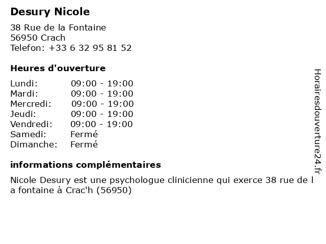 Nicole Desury est une psychologue clinicienne qui exerce 38 rue de la fontaine à Crac'h (56950)