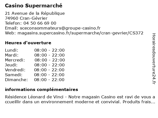 1 Casino Supermarché (Distance: 2,34 km) 50 Avenue du Parmelan, 74000 Annecy alimentation, boisson, casino, supermarché, épicerie 2 Casino Supermarché (Distance: 3,18 km) 7 Place du 18 Juin 1940, 74940 Annecy cafeteria, casino, discount, supermarche, supermarché 3 Casino Supermarché (Distance: 7,75 km) - place du docteur Dubois, 74330 La Balme-de-Sillingy alimentation, casino, fruits, légumes, supermarché, épicerie 4 Le Petit Casino (Distance: 0,44 km) 34 rue de la Tournette, 74290 Veyrier-Du-Lac alimentation, casino, fruits, le, légumes, petit, superette, épicerie 5 Casino Supermarché Drive (Distance: 0,89 km) 50 avenue du Palerman, 74960 Annecy alimentation, casino, distribution, drive, epiceries, supermarché 6 Vival By Casino (Distance: 1,16 km) 20 Avenue de Cran, 74000 Annecy alimentaire, by, casino, supermarché, supérette, vival, épicerie  |
