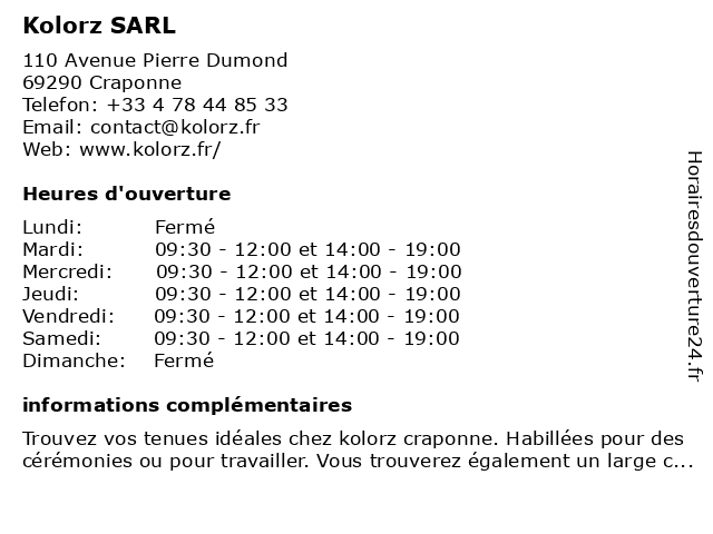 | Samedi | 09:30-12:00 et 14:00-19:00 |