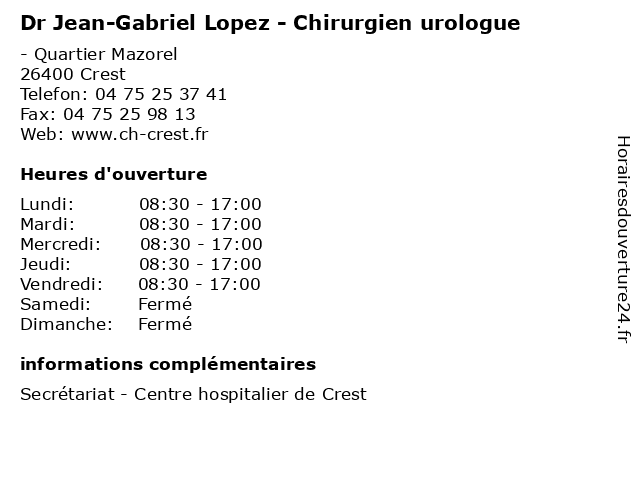 Termes de recherche pour Dr Jean-Gabriel Lopez - Chirurgien urologue:jean, centre, general, soins, gabriel, lopez, crest, hospitalier, dr, chirurgien, urologue, chiurgie |