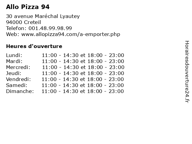 | Lundi | 11:00-14:30 et 18:00-23:00 |