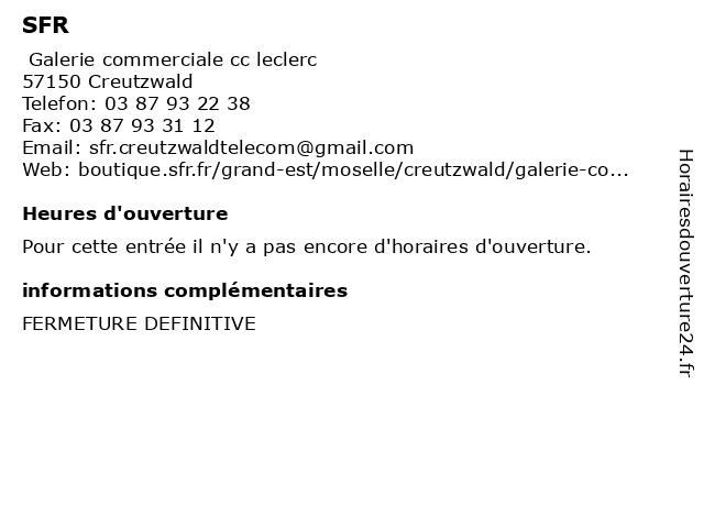 2 espace SFR (Distance: 8,53 km) s/n Zone commerciale du Heckenwald, La Galerie Cora St-Avold, 57740 Longeville-lès-St-Avold accessoires de téléphonie mobile, boutique de téléphonie mobile, communications mobiles, contrats de téléphonie mobile, espace, sfr, téléphone portable 3 SFR Longeville Les Saint Avold (Distance: 8,57 km) C Cial Cora, 57740 Longeville Les Saint Avold avold, compagnie de téléphone, les, longeville, magasin de téléphones mobiles, saint, sfr, vente et installation du câble et du satellite 4 SFR Farebersviller (Distance: 14,03 km) C Cial Auchan, 57450 Farebersviller compagnie de téléphone, farebersviller, magasin de téléphones mobiles, sfr, vente et installation du câble et du satellite 5 Point Service Mobiles (Distance: 14,38 km) 125 Rue Nationale, 57600 Forbach mobiles, point, réparateurs, service, services, téléphonie 6 Telephone Store (Distance: 16,27 km) 5 Place Du General De Gaulle, 57320 Bouzonville accessoires, mobiles, services, store, telephone |