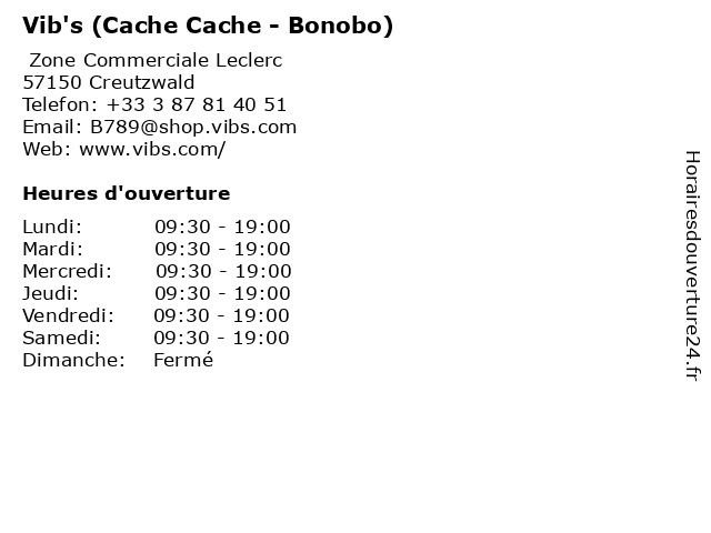 1 Vib's (Cache Cache - Bonobo) (Distance: 0,15 km) Rue de Saint-Brieuc, 57150 Creutzwald bonobo, cache, vib's 6 Cache Cache (Distance: 8,74 km) Zone Commerciale Du Heckenwald, 57740 Longeville-lès-Saint-Avold blazer femme, boutique vêtement, cache, cache cache, cardignan femme, chaussures femme, gilet femme, jean femme, magasin vêtement, manteau femme, mode femme, pull femme, robe femme, sac femme, t-shirt femme, tailleur femme, top femme, vêtement femme |