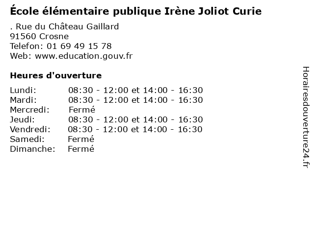 1 École élémentaire publique Irène Joliot Curie (Distance: 4,98 km) 15 Rue du Docteur Calmette, 94310 Orly cours, curie, education, irène, joliot, publique, services, École, école, élémentaire 2 École élémentaire publique Irène Joliot Curie (Distance: 11,53 km) 2 Avenue Anne Godeau, 91390 Morsang-sur-Orge cours, curie, irène, joliot, publique, services, école, élémentaire 3 École élémentaire publique Irène Joliot Curie (Distance: 11,58 km) 56 Rue Jean Baptiste Baudin, 94800 Villejuif cours, curie, education, irène, joliot, publique, services, École, école, élémentaire 4 École élémentaire publique Ferdinand Buisson (Distance: 2,39 km) 127 Avenue de la République, 91230 Montgeron buisson, cours, ferdinand, publique, services, école, élémentaire 5 École élémentaire publique Paul Langevin (Distance: 2,39 km) 85 Sacco Vanzetti, 94460 Valenton ecole, education, langevin, paul, publique, services, école, élémentaire 6 École élémentaire publique Victor Hugo (Distance: 2,78 km) . Rue Jean Boulin, 91330 Yerres cours, hugo, publique, servicios, victor, école, élémentaire |