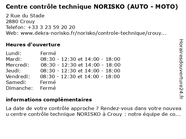 Description de l'entreprise :Préparer votre contrôle techniquePour préparer votre contrôle technique dans notre centre NORISKO de Crouy, vous pouvez vérifier en amont différents points comme les pneumatiques, la visibilité, le niveau d'huile ou encore l'habitacle. Pour tout savoir, consultez notre vidéo. Voir l'offre |