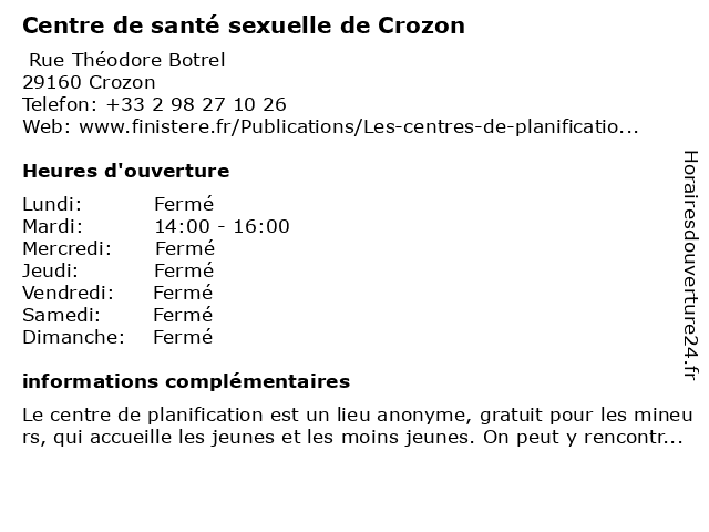 Termes de recherche pour Centre de santé sexuelle de Crozon:de, crozon, centre, santé, sexuelle |
