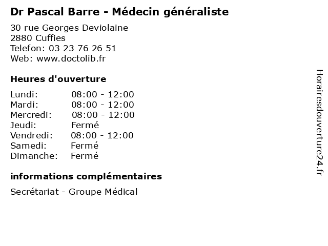 2 Dr Pascal Abboud - Gynécologue médical et obstétrique (Distance: 3,25 km) 46 avenue du Général de Gaulle, 02209 Soissons abboud, consultation, docteur, dr, et, gynécologue, med, médecin, médecine, médical, obstétrique, pascal, traitement 3 Dr. Pascal Jacob - Médecine générale (Consultation sur rendez-vous) (Distance: 6,10 km) 1029 Rue Gambetta, 02200 COURMELLES consultation, docteur, dr., générale, jacob, médecine, pascal, rendez, santé, sur, vous 4 Dr. Pascal Jacob - Médecine générale (Consultation libre) (Distance: 6,10 km) 1029 Rue Gambetta, 02200 COURMELLES consultation, docteur, dr., générale, jacob, libre, médecine, pascal, santé 5 Dr. Pacsal Barre -Médecine générale (Consultation libre) (Distance: 16,33 km) 38 Rue du Martroy, 02220 Braine barre, consultation, docteur, dr., générale, libre, médecine, pacsal, santé 6 Dr. Pacsal Barre -Médecine générale (Consultation sur rendez-vous) (Distance: 16,33 km) 38 Rue du Martroy, 02220 Braine barre, consultation, docteur, dr., générale, médecine, pacsal, rendez, santé, sur, vous |