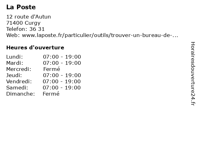 1 La Poste (Distance: 7,37 km) - rue des Ormes, 71400 Autun express chronopost, la, poste, réexpédition internationale 2 La Poste (Distance: 7,39 km) Rue Antoine Clément, 71400 Saint-Pantaléon agence, assurance, banque, banque postale, bureau de poste, chronopost, colis, courrier, dps, expéditions internationales, la, point, postale, poste, relais, timbres, téléphonie, ups, western union 3 La Poste (Distance: 9,92 km) 14 Rue du Général de Gaulle, 71490 Saint-Émiland agence, assurance, banque, banque postale, bureau de poste, chronopost, colis, courrier, dps, expéditions internationales, la, point, postale, poste, relais, timbres, téléphonie, ups, western union 4 La Poste (Distance: 14,47 km) Place Lucie Aubrac, 71190 Broye agence, assurance, banque, banque postale, bureau de poste, chronopost, colis, courrier, dps, expéditions internationales, la, point, postale, poste, relais, timbres, téléphonie, ups, western union 5 La Poste (Distance: 15,39 km) - Le Bourg, 71200 Saint-Sernin-du-Bois agence, assurance, banque, banque postale, bureau de poste, chronopost, colis, courrier, dps, expéditions internationales, la, point, postale, poste, relais, timbres, téléphonie, ups, western union 6 La Poste (Distance: 16,02 km) 24 Rue du Bourg, 71710 Marmagne express chronopost, la, poste, réexpédition internationale |