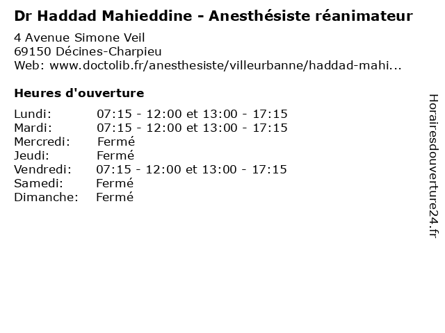 | Mardi | 07:15-12:00 et 13:00-17:15 |