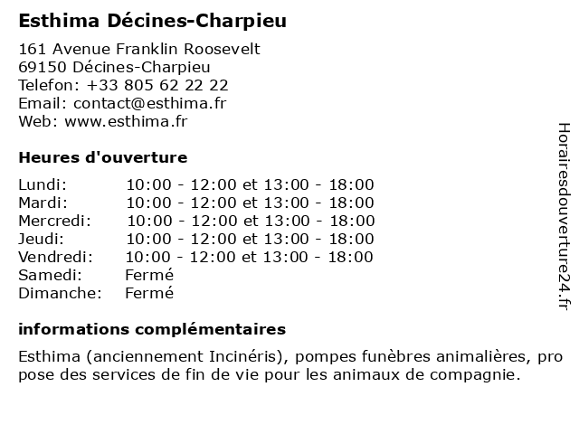1 Esthima (Distance: 0,01 km) 161 Avenue Franklin Roosevelt, 69150 Décines-Charpieu animaux, crématorium, esthima, fin de vie, mort, pompes funèbre, service 2 Esthima (Distance: 38,70 km) 255 Rue Charles-de-Gaulle, 01500 Château-Gaillard animal, cremation, deces, esthima, funebres, horaires, incineris, incinéris, ouverture, pompes 3 Esthima Château-Gaillard (Distance: 38,73 km) 255 Avenue Charles de Gaulle, 01500 Château-Gaillard château, esthima, gaillard |