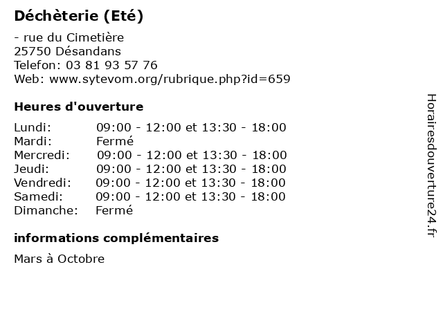 1 Déchèterie (Eté) (Distance: 7,81 km) - Avenue du Mont Vaudois, 70400 Héricourt bennes, débarras, déchèterie, détritus, eté, ordures, poubelles, été 2 Déchèterie (Eté) (Distance: 10,97 km) - Route de Courmont, 70400 Saulnot bennes, débarras, déchèterie, détritus, eté, ordures, poubelles, été 3 Déchèterie (Eté) (Distance: 11,78 km) - route départementale 683, 25250 Isle-sur-le-Doubs bennes, débarras, déchèterie, détritus, eté, ordures, été 4 Déchèterie (Eté) (Distance: 11,95 km) n/c route de Brevilliers, 90700 Châtenois-les-Forges bennes, débarras, déchèterie, détritus, eté, ordures, poubelles, été 5 Déchèterie (Hiver) (Distance: 1,27 km) - rte d'Echenans, 25750 Désandans bennes, débarras, déchèterie, détritus, hiver, ordures, poubelles 6 Allo-dechetterie (Eté) (Distance: 8,60 km) - Boulevard du 21è, 25200 Montbéliard allo, dechetterie, eté, gravats, huiles usées, la réception des déchets et écocentres, les appareils électroménagers, les déchets verts, papier et carton en quantité |