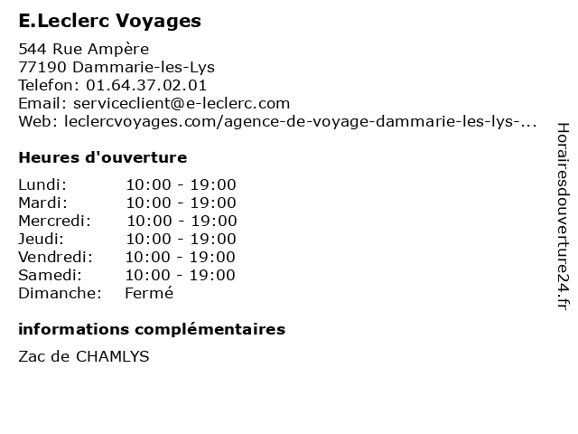 1 E.Leclerc borne (Distance: nan km) 544 Avenue André Ampère, 77190 Dammarie les Lys borne, e.leclerc, service, services, services à la personne 2 E.Leclerc Une heure pour soi (Distance: nan km) 544 Avenue André Ampère, 77190 Dammarie les Lys e.leclerc, heure, pour, service, services, services à la personne, soi, une 3 E.Leclerc Espace culturel (Distance: nan km) 544 Avenue André Ampère, 77190 Dammarie les Lys culturel, e.leclerc, espace, service, services, services à la personne 4 E.Leclerc Dammarie les Lys (Distance: nan km) 544 Avenue André Ampère, 77190 Dammarie les Lys dammarie, e.leclerc, les, lys, service, services, services à la personne 5 E.Leclerc Espace Culturel (Distance: 0,25 km) Centre commercial chamlys, 77190 Dammarie Les Lys culturel, e.leclerc, espace, fournisseur de matériel audiovisuel, librairies, magasin de jeux vidéo, magasin de musique, matériel de photographie, matériel vidéo, services et matériel vidéo 6 Carrefour Voyages (Distance: 2,58 km) 7 Route Nationale, 77190 Villiers-en-Biere agences, carrefour, location, vacances, voyages |