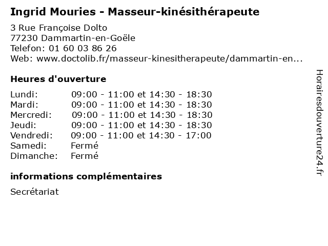 | Mercredi | 09:00-11:00 et 14:30-18:30 |