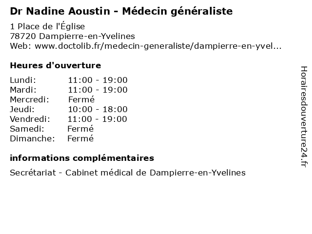 1 Dr Nadine Aostin - Médecin généraliste (Distance: 0,00 km) 1 Place de l'Église, 78720 Dampierre-en-Yvelines aostin, dr, généraliste, médecin, médecine, médical, nadine, pharmaceutique, traitement 2 Nadine Cherarad - Sage-femme (Distance: 13,10 km) 5-7 rue Pierre et Marie Curie, 78120 Rambouillet cherarad, consultation, docteur, dr, femme, med, médecin, nadine, sage, traitement 3 Nadine Chaligné - Psychologue (Distance: 13,59 km) 5 bis Rue de Limours, 91470 Angervilliers chaligné, folie, nadine, psychiatre, psychiatrie, psychiatrique, psychologue 4 Dr Nadine Coing - Médecin généraliste (Distance: 14,13 km) 2 Rue de Paris, 91400 Saclay coing, docteur, dr, generaliste, généraliste, medical, médecin, nadine, soin 5 Dr.Nadine Merville - Pédiatre (Distance: 15,12 km) 2 rue de Marly, 78150 Le Chesnay consultation, docteur, dr.nadine, merville, pédiatre, pédiatrie, santé 6 Dr Nadine Bollon - Chirurgien-dentiste - secrétariat (Distance: 15,69 km) 92 Avenue de Paris, 78000 Versailles bollon, chirurgien, consultation, dentiste, docteur, dr, med, médecin, médecine, nadine, secrétariat, traitement |
