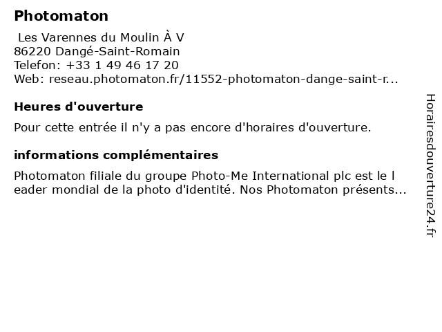 3 Photomaton (Distance: 13,17 km) 107 Avenue du Maréchal de Lattre de Tassigny, 86100 Châtellerault photomaton 6 Photomaton (Distance: 15,11 km) . Avenue Jean Moulin, 86100 Chatellerault beaute, cafe, chaussures, enfants, lingerie, mode femmes, mode hommes, photomaton, restaurant, service, sport |