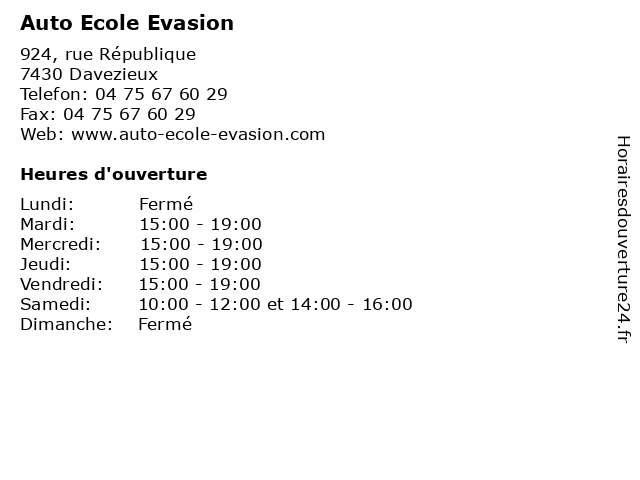 1 Auto Ecole Evasion (Distance: 7,36 km) - Route nationale 86, 07340 Andance auto, auto / moto, ecole, entraînement, evasion, services 2 Auto Ecole Evasion (Distance: 11,49 km) 96, av Jean Jaurès, 26240 St Vallier auto, auto / moto, ecole, entraînement, evasion, services 3 Selectour - Ardèche Evasion (Distance: 1,73 km) - Espace Charmenton, 07430 Davézieux ardèche, billets de train, evasion, selectour, séjours, vols, voyage 4 Jetset Voyages / Ardèche Evasion (Distance: 2,70 km) - Charmenton, 07430 Davezieux agence, ardèche, billet d'avion et hôtel pour votre club, evasion, jetset, séjour, voyages 5 Cap Evasion (Distance: 2,80 km) 2491 Route Departementale 820, 07430 Saint Clair accessoires, bivouac, camping-car, cap, evasion, location, vente 6 Auto-École Cap Permis (Distance: 32,10 km) 13 rue du 11 Novembre, 38200 Vienne auto, auto / moto, cap, ecole, entraînement, permis, services, école |