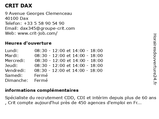 2 CRIT MONT-DE-MARSAN (Distance: 48,60 km) 13 Allée Raymond Farbos, 40000 Mont-de-Marsan crit, de, marsan, mont |