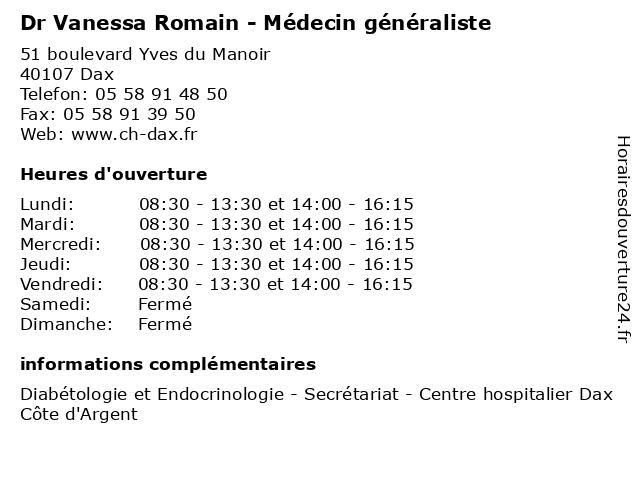 Termes de recherche pour Dr Vanessa Romain - Médecin généraliste:et, romain, dax, centre, vanessa, généraliste, hospitalier, médecin, dr, endocrinologie, endocrinologue, diabète, diabétologue, endo |