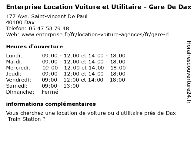 Termes de recherche pour Enterprise Location Voiture et Utilitaire - Gare De Dax:et, de, dax, gare, location, voiture, enterprise, utilitaire |