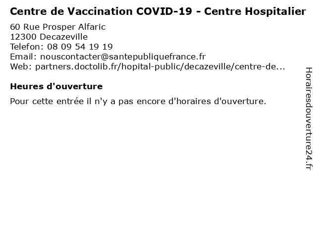 1 Centre de Vaccination COVID-19 - Centre Hospitalier (Distance: 18,09 km) 7 rue du stade, 46100 Figeac 19, centre, covid, covid 19, covid19, de, hospitalier, médecin, médecine, médical, test, vaccin, vaccination, vaccins 2 Centre hospitalier (Decazeville) (Distance: 0,00 km) 60 Avenue Prosper Alfaric, 12300 Decazeville centre, decazeville, docteur, hospitalier, medecins, sante 3 Centre Hospitalier De Figeac (Distance: 17,82 km) 3 Rue du 11 Novembre 1918, 46100 Figeac centre, de, figeac, hospitalier 4 Centre hospitalier (Figeac) (Distance: 18,15 km) 33 Rue des Maquisards, 46106 Figeac centre, docteur, figeac, hospitalier, medecins, sante 5 Centre de Vaccination COVID-19 (Distance: 29,59 km) - Rue des treize pierres, 12200 Villefranche-de-Rouergue 19, centre, covid, covid 19, covid19, de, médecin, médecine, médical, test, vaccin, vaccination, vaccins 6 Centre de Vaccination COVID-19 - CH de Rodez - Hôpital Jacques Puel (Distance: 33,53 km) 8 Avenue de l'Hopital, 12000 Rodez 19, centre, ch, covid, covid 19, covid19, de, hôpital, jacques, médecin, médecine, médical, puel, rodez, test, vaccin, vaccination, vaccins |