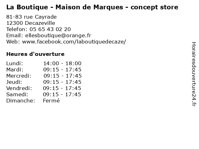 1 Telephone Store (Distance: 0,04 km) 11 Rue Cayrade, 12300 Decazeville accessoires, mobiles, services, store, telephone 2 Secours Catholique - Boutique Solidaire (Distance: 0,19 km) 10 Place du 10 Août, 12300 Decazeville associatif, association, boutique, bénévolat, bénévole, catholique, secours, solidaire, solidarité 3 Comité d'Amis Emmaüs - Boutique Solidaire (Distance: 0,52 km) - Rue Miramont, 12300 Decazeville achats, boutique, collectes, comité, d'amis, dons, d’amis, emmaüs, solidaire, soutiens, ventes 4 Boutique-Traiteur Ô Chêne (Distance: 16,54 km) 957 route de Fumat, 46100 Figeac boutique, chêne, plats, restaurant, restauration, traiteur 5 Boutique Le46 (Distance: 18,49 km) 6 bis Rue Gambetta, 46100 Figeac 46, accessoires, boutique, le, le46, mode, vêtements 6 La Boutique - Bijoux Fantaisie (Distance: 18,49 km) - Place Champollion, 46100 Figeac bijoux, boutique, bracelets, fantaisie, horlogerie, la |