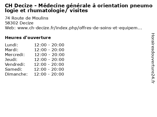 1 CH Decize - Cardiologie / visites (Distance: 0,00 km) 74 Route de Moulins, 58302 Decize bureau, cardiologie, ch, consultation, decize, dr, maladie, med, médecin, médecine, pratique, thérapie, traitement, visites 2 CH Decize - Imagerie médicale (Distance: 0,00 km) 74 Route de Moulins, 58302 Decize bureau, ch, consultation, decize, dr, imagerie, maladie, med, médecin, médecine, médicale, pratique, thérapie, traitement 3 CH Decize - Laboratoire (Distance: 0,00 km) 74 Route de Moulins, 58302 Decize bureau, ch, consultation, decize, dr, laboratoire, maladie, med, médecin, médecine, pratique, thérapie, traitement 4 CH Decize - Médecine générale à orientation gastroentérologie et alcoologie/ visites (Distance: 0,00 km) 74 Route de Moulins, 58302 Decize alcoologie/, bureau, ch, consultation, decize, dr, et, gastroentérologie, générale, maladie, med, médecin, médecine, orientation, pratique, thérapie, traitement, visites 5 CH Decize - Service de soins de suite et réadaptation / visites (Distance: 0,00 km) 74 Route de Moulins, 58302 Decize bureau, ch, consultation, de, decize, dr, et, maladie, med, médecin, médecine, pratique, réadaptation, service, soins, suite, thérapie, traitement, visites 6 CH Decize - Unité d'hospitalisation de courte durée / visites (Distance: 0,00 km) 74 Route de Moulins, 58302 Decize bureau, ch, consultation, courte, d'hospitalisation, de, decize, dr, durée, maladie, med, médecin, médecine, pratique, thérapie, traitement, unité, visites |
